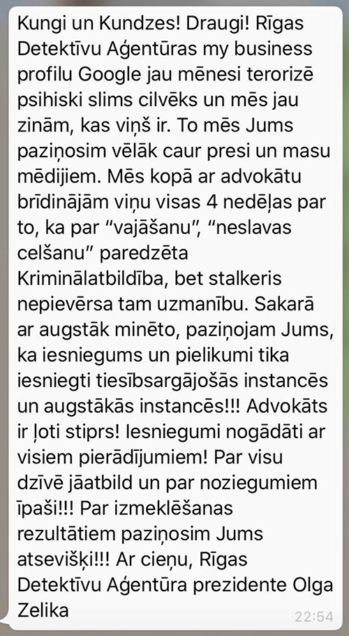 Rīgas Detektīvu Aģentūra, talr. 26065555 prezidente Olga Zelika bija spiesta vērsties Galvenajā Policijas Parvaldē un Valsts instancēs ar iesniegumu saistībā ar to, r>ka jau vairāk kā vienu mēnesi firmu terorizē stalkeris Rigas Detektivu Agentura my business profilā. Par izmeklēšanas rezultātiem Jūs informēsim.